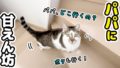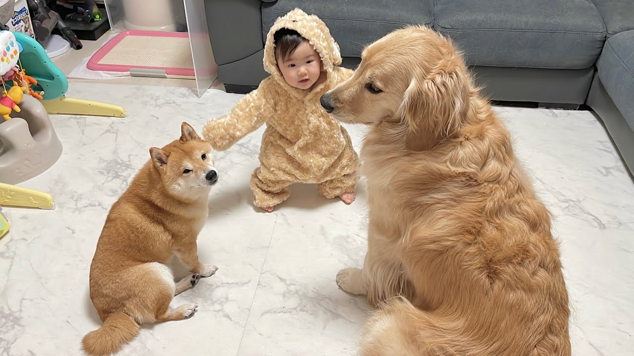 ママがいない間に得意の立ち姿を見せつける0歳児とその姿を見守る豆柴とゴールデンレトリバー【犬】