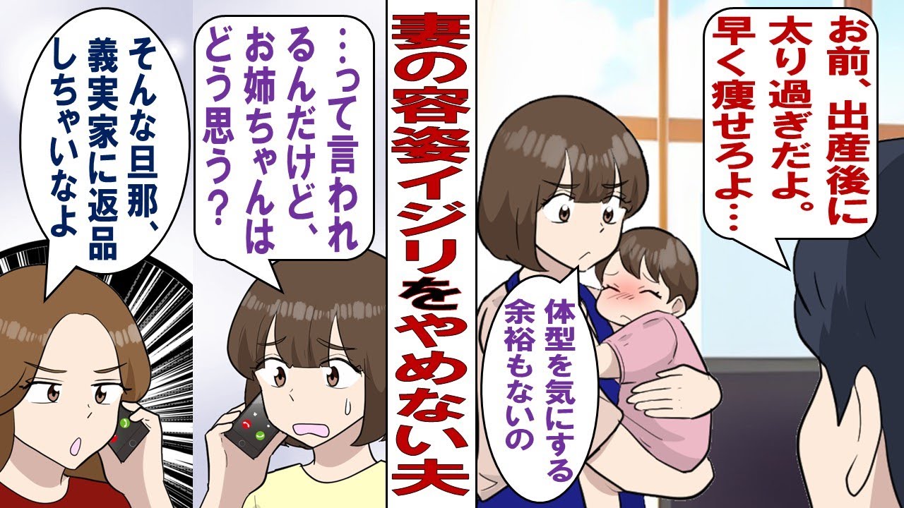 「私はメグミ。半年前に娘のナナを出産し絶賛育休中。いま一番のストレスは夫のマモルだ。マモルは私が太っただの女を捨ててるだのと私の外見についてのダメ出しをしてくる。私がやめて欲しいと言ってもそれをやめようとしない。もともと出産前の私は痩せすぎで今の体重は平均ぐらいだ。でも、それを言ってもマモルは納得しなかった。数日たってもイライラが収まらない私は、姉に話を聞いてもらうことにした。すると姉は・・・」