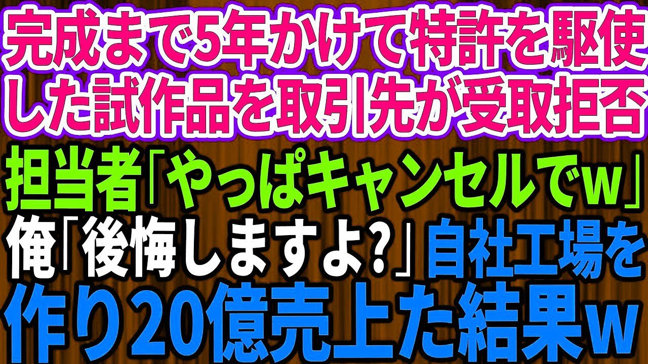 - タイトル: 【スカッとする話】完成まで5年間かけ特許技術を駆使した試作品を取引先の担当者に受け取り拒否された「やっぱキャンセルでw」俺「後悔しますよ?」→速攻で自社工場を作り20億円売上げた結果