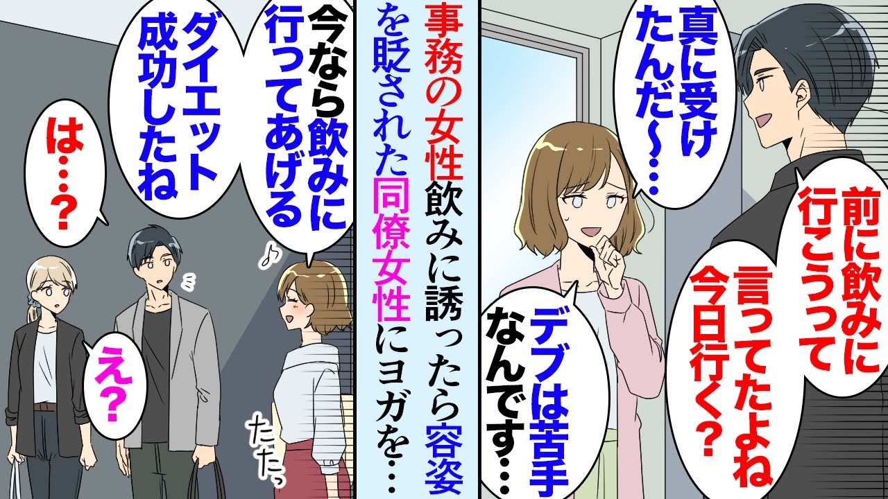 - タイトル: 【漫画】「今度飲みに誘って下さい」という女性事務員の言葉を真に受けて週末飲みに誘ったら「タイプじゃないんでw痩せたら考えます」容姿を貶された→中途採用で入社した女性社員に飲みに誘われ…【マンガ動画】