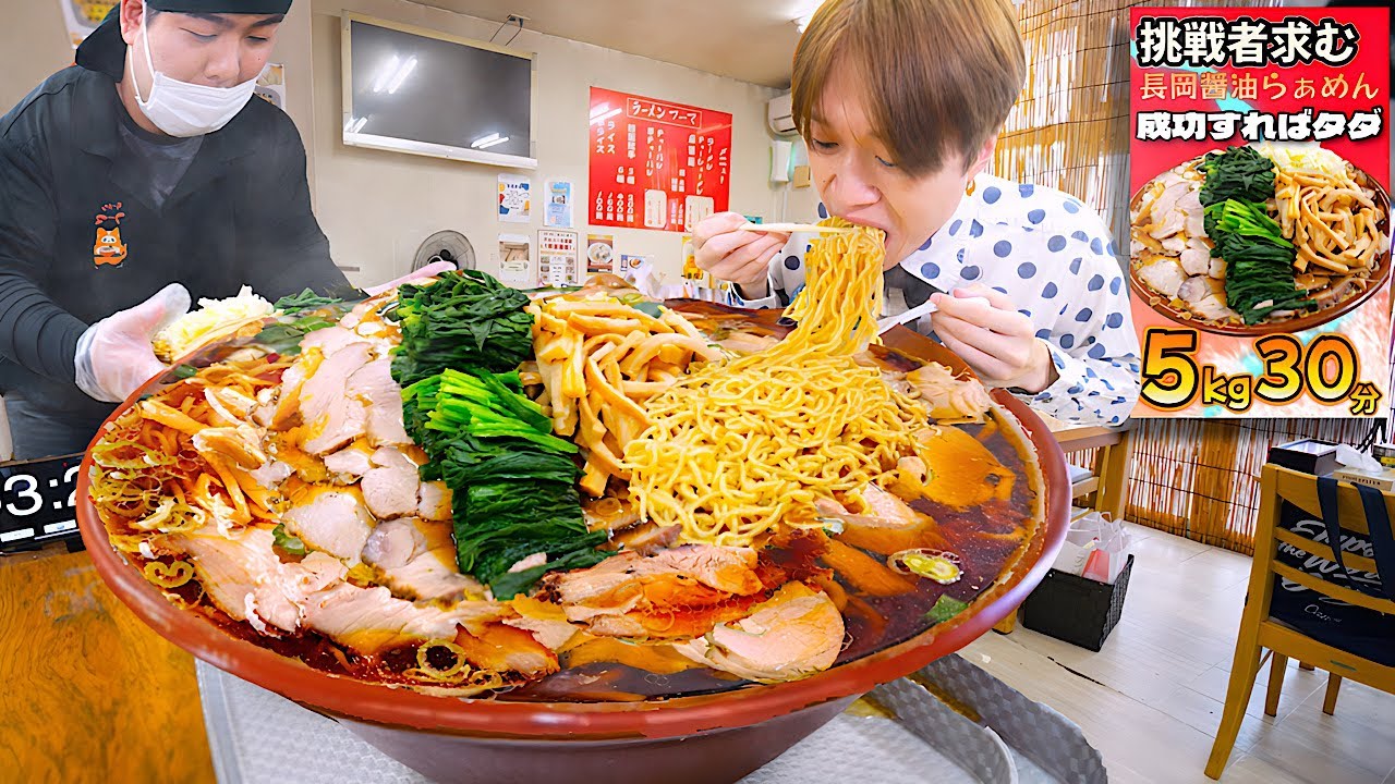 - タイトル: 【大食い】朝6時営業のラーメン屋⁉️新潟長岡醤油ラーメン総重量5kgを制限時間30分で完食すればお代金無料‼️【大胃王】【ラーメンフーマ伊勢崎】