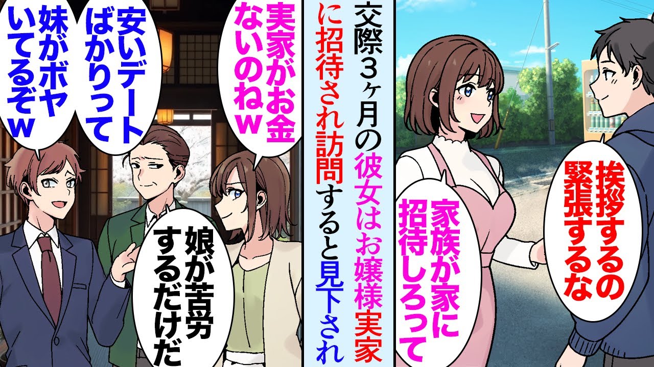 - タイトル: 【漫画】交際3ヶ月のお嬢様彼女が家族に紹介したいらしく実家を訪問した「実家が貧乏なのかw」「記念日にプレゼントもくれないんだろ?別れたら?」→彼女兄とご両親にボロボロに見下され別れたが【マンガ動画】