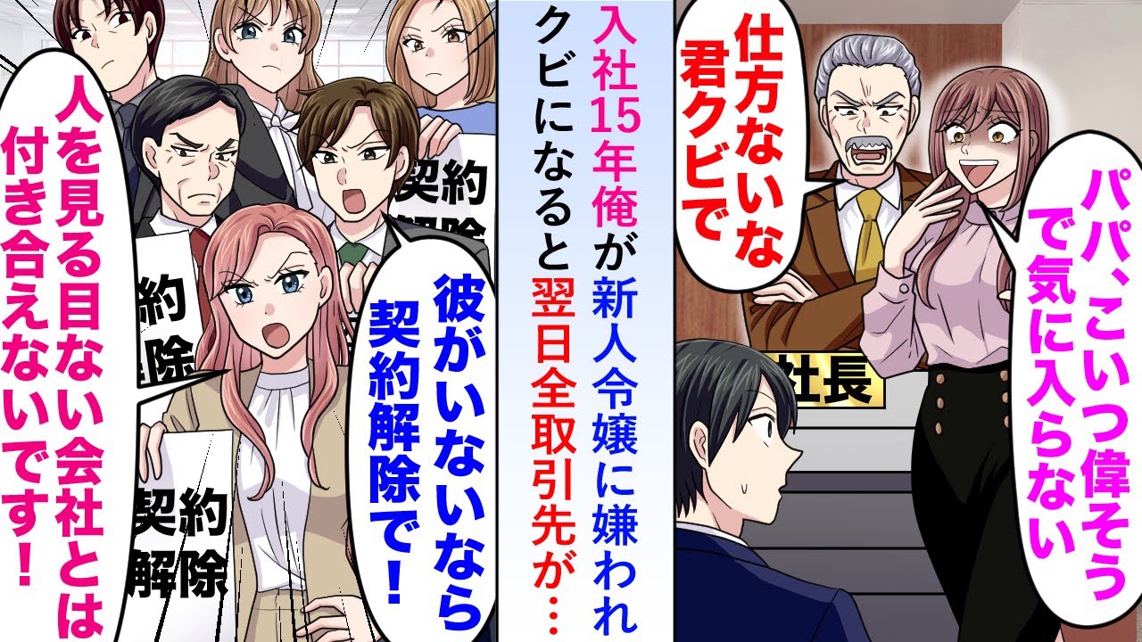 - タイトル: 【漫画】入社15年俺が新人令嬢に嫌われクビになると翌日全取引先が「彼がいないなら契約解除で」と会社に集結し…【恋愛マンガ動画】