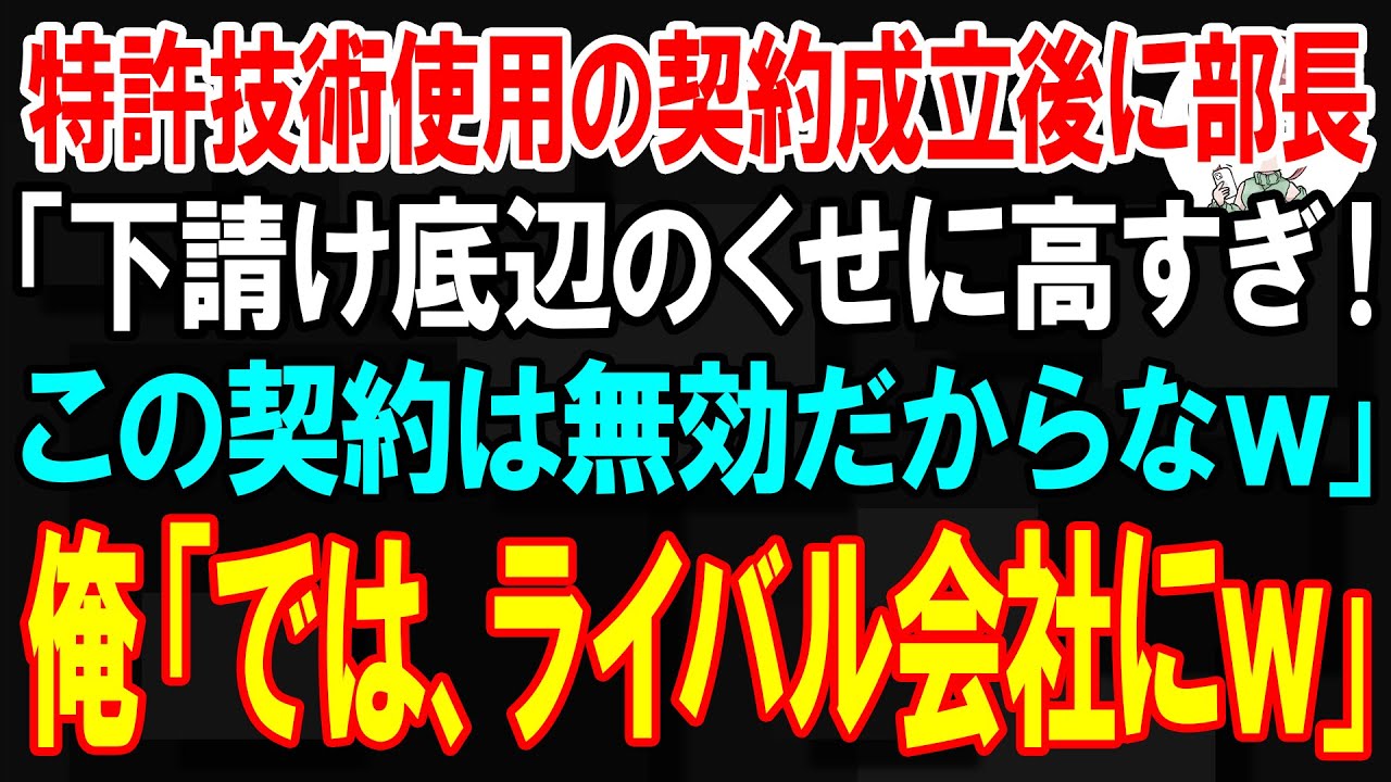 - タイトル: 【スカッと】特許技術使用の契約成立後に部長「下請け底辺のくせに高すぎ!この契約は無効だからなw」俺「では、ライバル会社にw」【朗読】【修羅場】