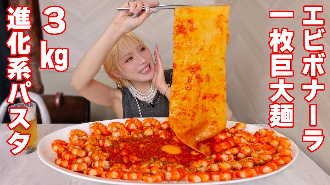 • タイトル: 【大食い】一枚が50㎝!巨大麺のエビパスタ3㎏!バズりデカ盛り【ますぶちさちよ】