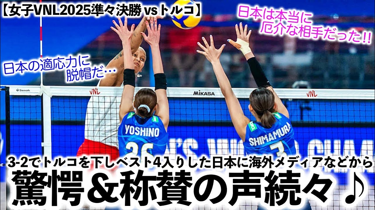 - タイトル: 【女子VNL2025準々決勝 vsトルコ】「日本の適応力に脱帽だ…‼︎」3-2でトルコを下した日本に海外から驚愕&称賛の声続々♪