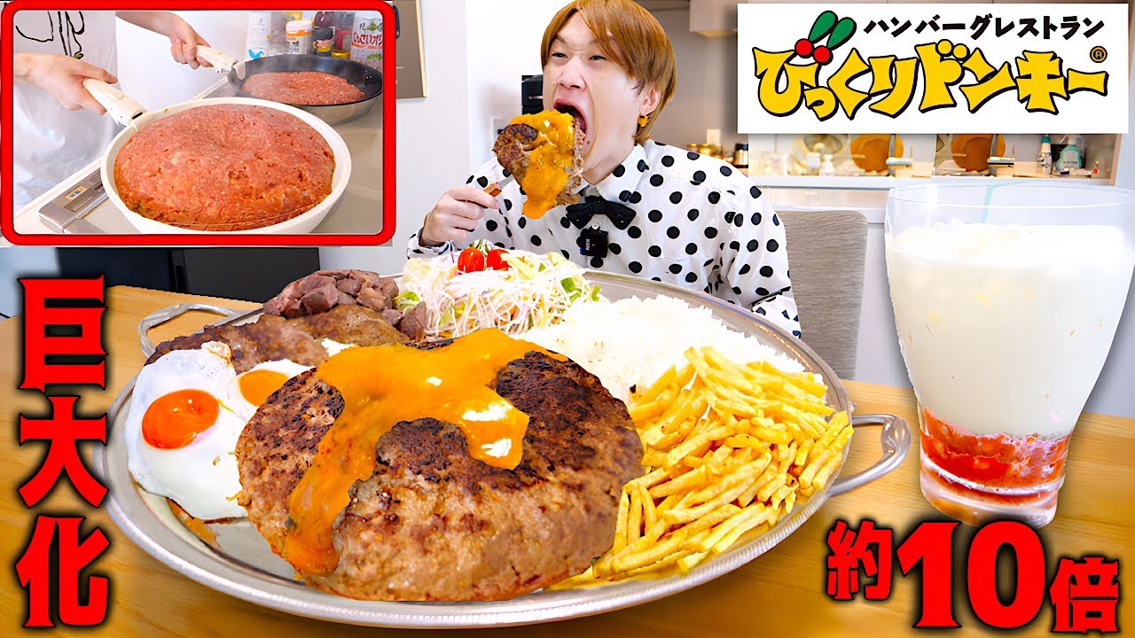 - タイトル: 【大食い】巨大びっくりドンキー再現‼️10倍サイズの国産牛100%巨大ハンバーグプレートを作ったら最高すぎたよ。【大胃王】【くませれ】