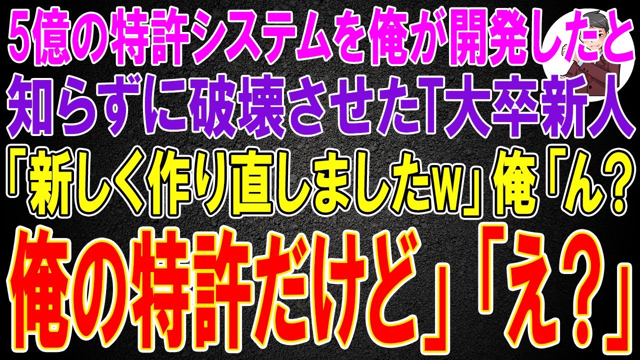 • タイトル: 【スカッと】5億の特許システムを俺が開発したと知らずに破壊させたT大卒新人「新しく作り直しましたw」俺「ん?俺の特許だけど」新人「え?」結果w