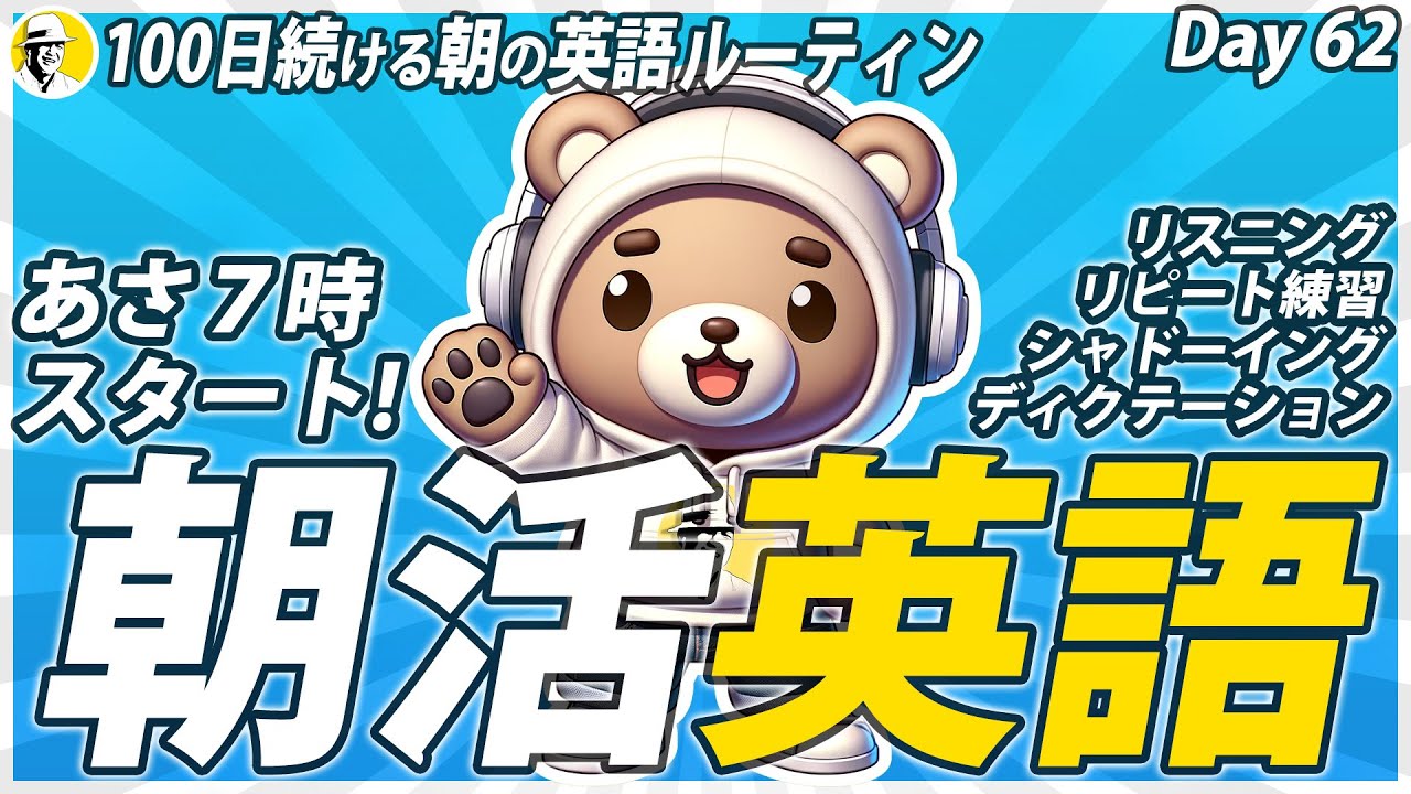 - タイトル: 【元祖】朝活英語リスニング (1/7)✨#100日続ける朝の英語ルーティン Day 62⭐️Week24⭐️100 Days English⭐️ 聞き流しシャドーイング&ディクテーション⭐️1604