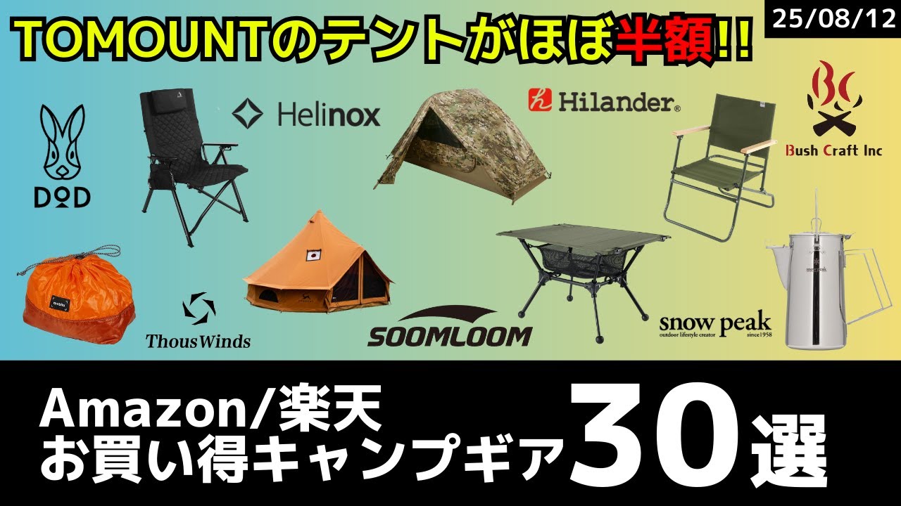 - タイトル: TOMOUNTのテントやSoomloom薪ストーブがお買い得!お盆も要チェックです!Amazon/楽天お買い得キャンプギア30選!【キャンプギア】
