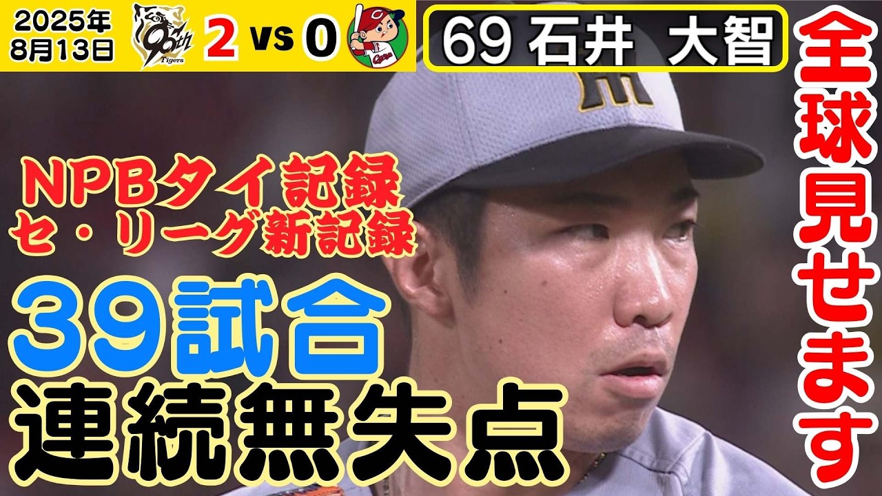 石井大智が13球で3奪三振のプロ野球記録達成!2025年8月13日 広島対阪神戦ハイライト