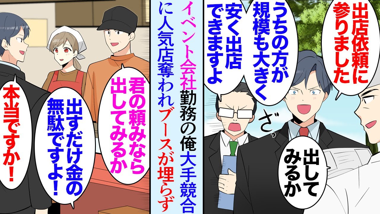 - タイトル: 【漫画】イベント会社に勤務する俺。最近大手競合に嫌がらせで集客を妨害をされて参っている「弱小はさっさと潰れろw」→フードフェスで人気店が続々と出店を取り消し、近所のラーメン屋の大将が…【マンガ動画】