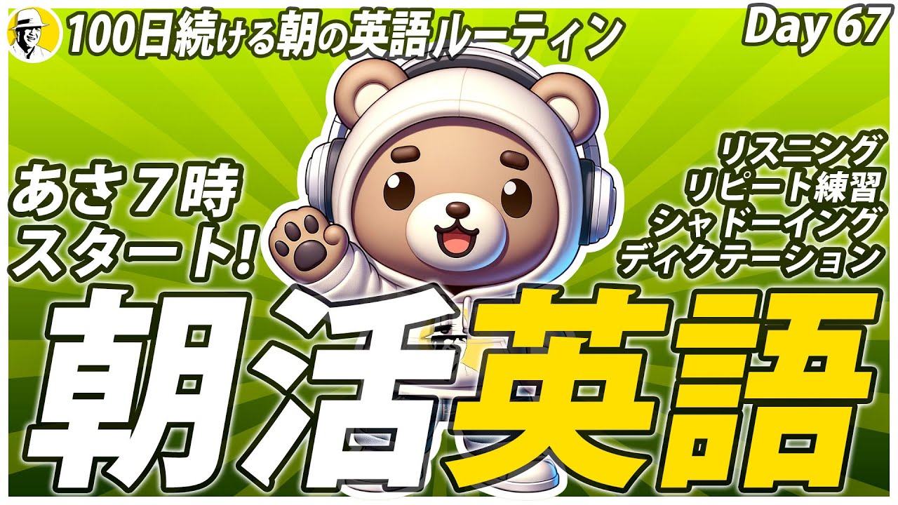 - タイトル: 【元祖】朝活英語リスニング (6/7)✨#100日続ける朝の英語ルーティン Day 67⭐️Week24⭐️100 Days English⭐️ 聞き流しシャドーイング&ディクテーション⭐️1609