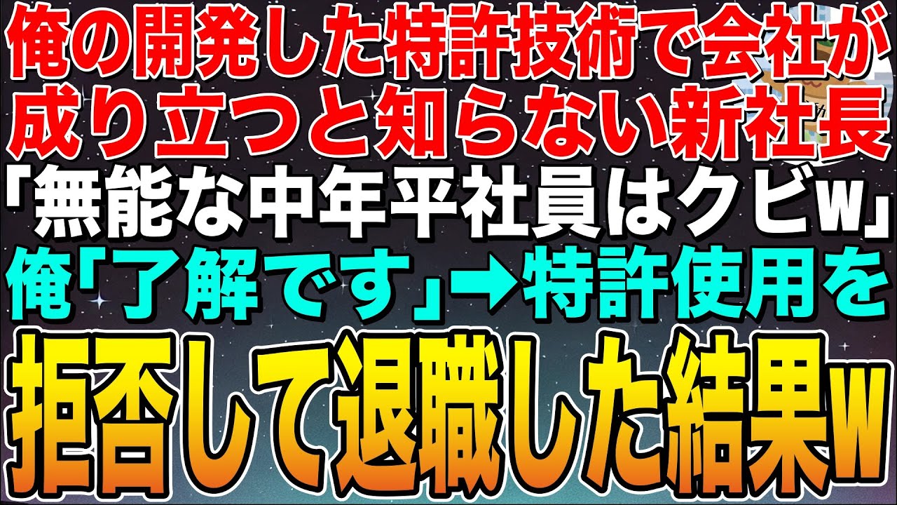 - タイトル: 【感動する話】俺の開発した特許技術で会社を支えていると知らない新社長「無能な中年平社員はクビw」俺「了解です」➡︎特許使用を拒否して退職した結果w【スカッと】【朗読】