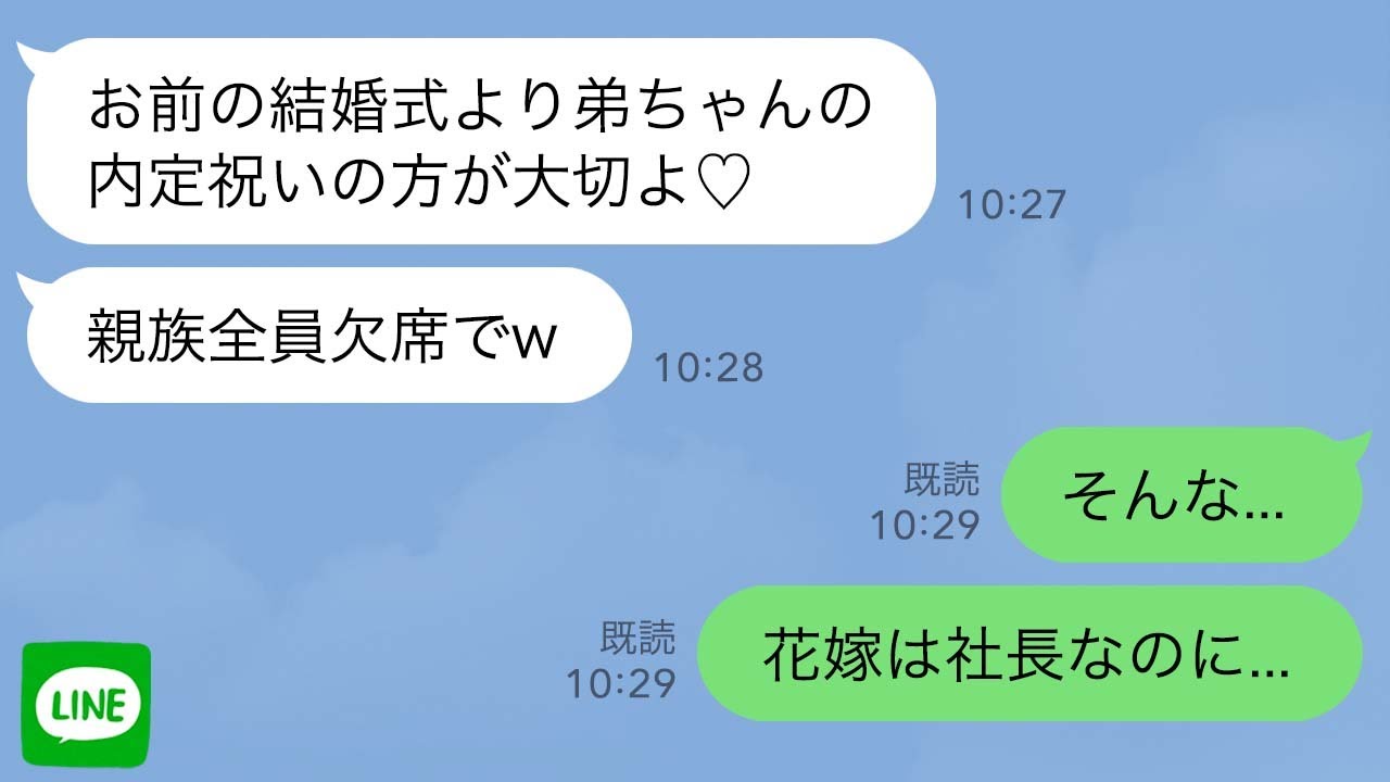 - タイトル: 【LINE】弟の内定祝いで俺の結婚式を親族全員で欠席「弟ちゃんの方が大切♡」→実は花嫁は社長で…
