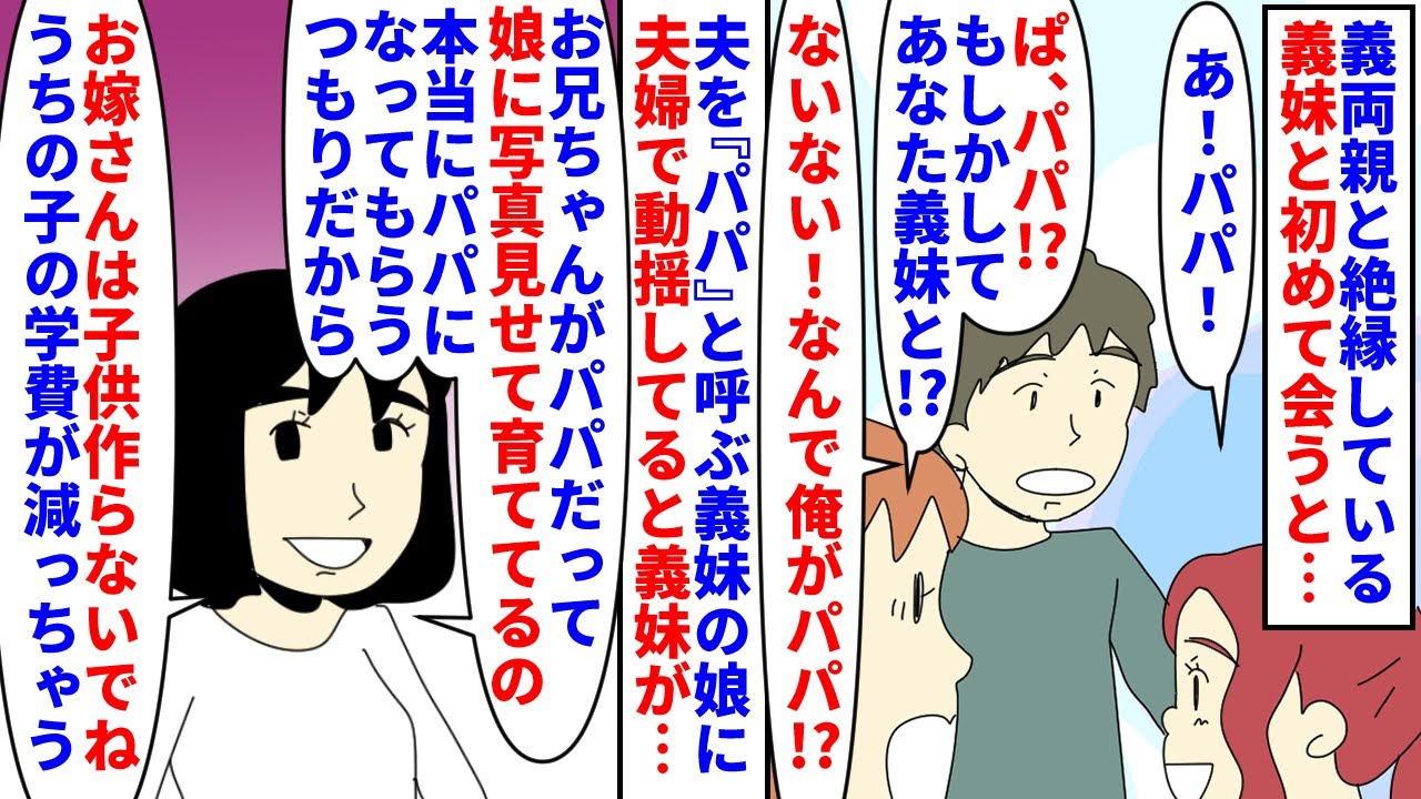- タイトル: 【漫画】義妹「お兄ちゃんを父親にするから養育費よろしく」義両親と絶縁している義妹と初対面→義妹子が夫をパパと呼ぶよう教育している義妹に子供を作るなと釘をさされ…(スカッと漫画)【マンガ動画】