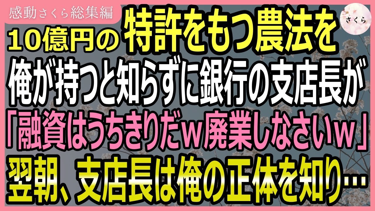 - タイトル: 【感動する話・総集編】10億円の特許を持つ農法を俺が持つと知らない銀行支店長「融資は打ち切りw廃業してくれw」→ところが翌朝、俺の正体を知った支店長は真っ青に【いい話・スカッと・スカッとする話・朗読】
