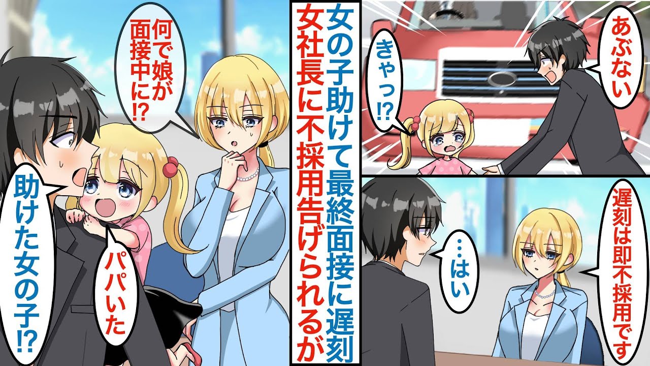 - タイトル: 【漫画】転職活動で失敗ばかりの俺が女の子を助けて最終面接に遅刻。美人女社長に不採用と言われたが部屋に彼女の娘が急に入ってきて「パパいた」実はシンママで父親似だったことで採用されるが【恋愛マンガ動画】