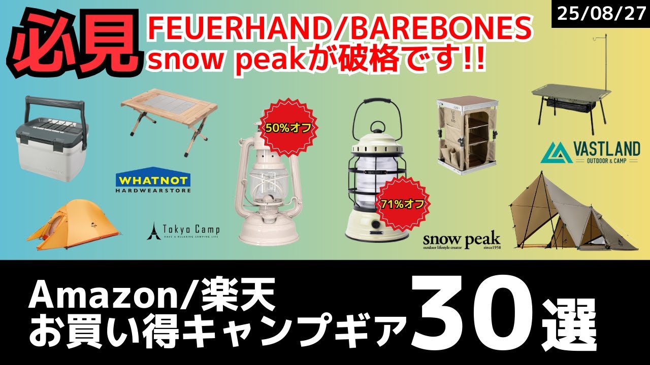 - タイトル: ベアボーンズが71%オフ、フュアハンドが半額とかヤバい!アメドも半額以下の過去最安に!絶対見たほうが良いAmazon/楽天お買い得キャンプギア30選!【キャンプギア】