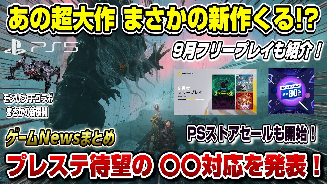 - タイトル: 【ゲームニュースまとめ】あの超大作にまさかの続編!? プレステ待望の〇〇対応を発表! 9月フリープレイも紹介! 新PSストアセール モンハンFFコラボまさかの新展開 PS5 switch2