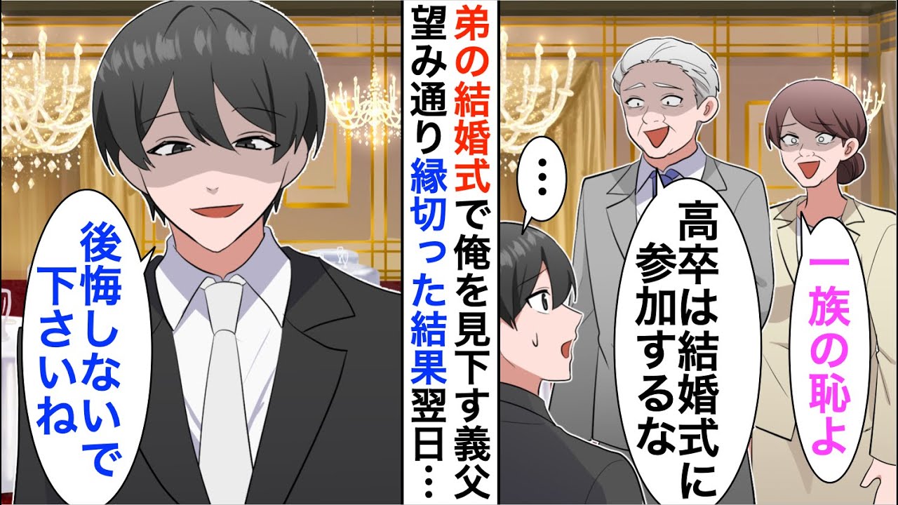 - タイトル: 【漫画】弟の結婚式で俺を見下す義父「高卒が結婚式に参加?」。望み通り縁切った結果【恋愛漫画】【胸キュン】