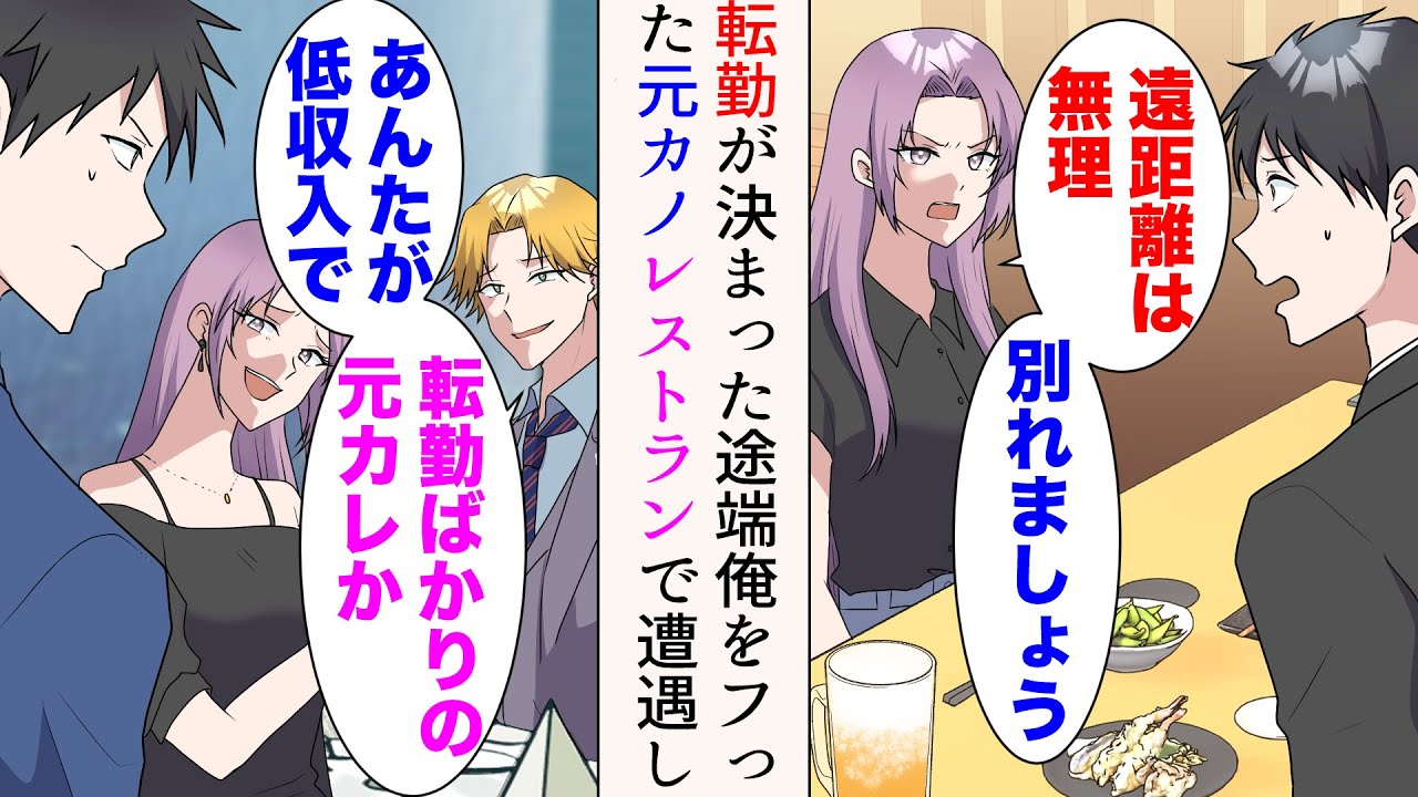 - タイトル: 【漫画】俺の転勤が決まった途端「遠距離は無理」と彼女にフラれた→レストランで彼氏とデート中の元カノと遭遇「年収一千万円の彼氏よ」「低収入で転勤ばかりの元カレかw」見下されたが…【マンガ動画】