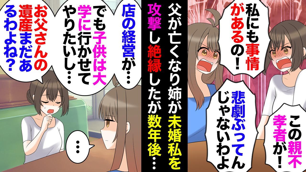 • タイトル: 【漫画】父が亡くなりオシャレカフェを夫婦で経営してる姉が私に「父子家庭で育ててもらったのに結婚もしない恩知らず!」私「」→葬儀後疎遠になったけど、数年後久しぶりに連絡がきたと思ったら…【マンガ動画】