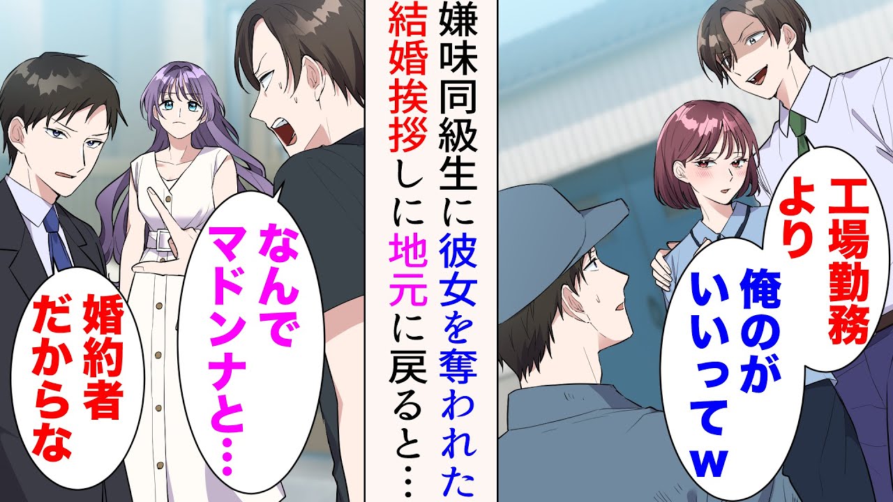 - タイトル: 【漫画】嫌味同級生に社内恋愛中の彼女を奪われた「工場勤務より俺のがいいってさw」→数年後、お盆休みに結婚挨拶に行くと、元カノ夫婦に遭遇し…【マンガ動画】