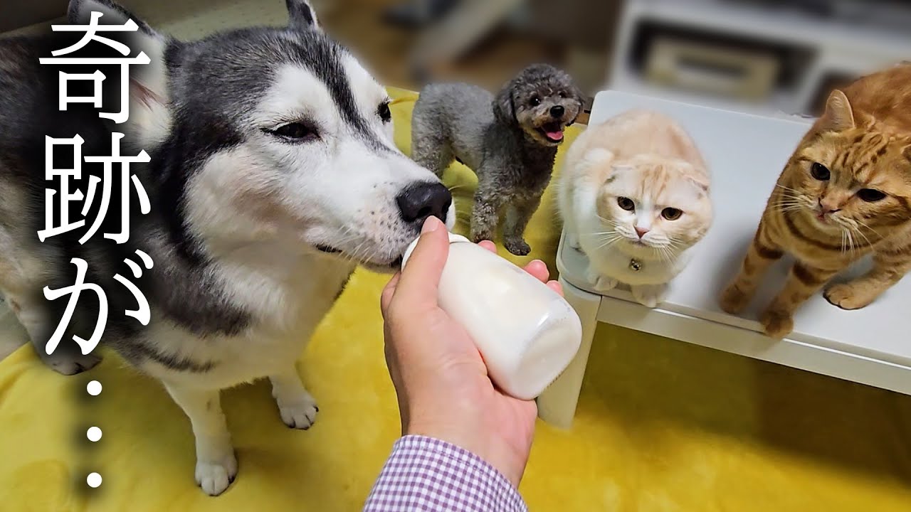 スコティッシュフォールド,子猫,犬と猫,猫と犬,ハスキー犬,ハスキー犬が育てた子猫,癒し,犬が育てた猫,猫動画,一口もごはんを食べないのでミルクをあげてみた結果…,奇跡が