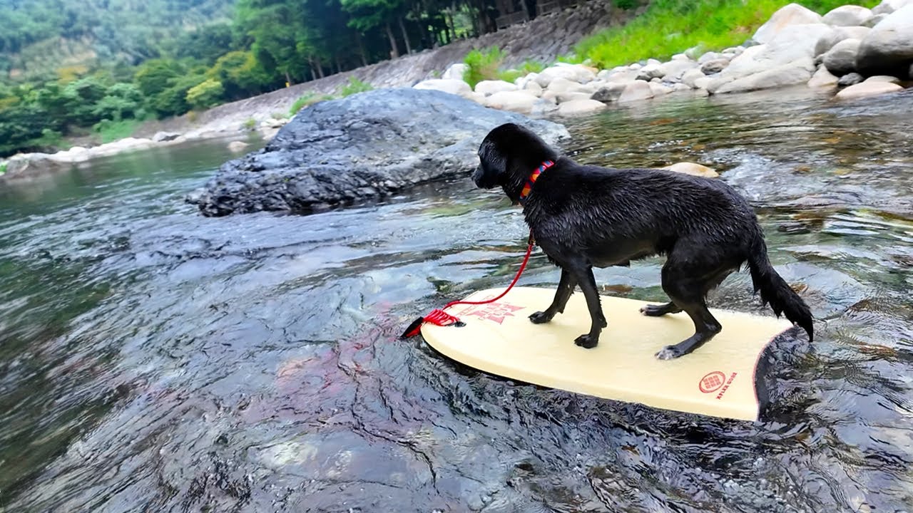 注目のハイライトは、ボディボードに乗って川下りに挑戦する「つき」の姿です。最初は少し戸惑っていたものの、すぐに慣れて楽しんでいる様子が伝わってきます。犬がボディボードに乗って川下りをするのは珍しい光景ですが、「つき」は見事に乗りこなしています。
