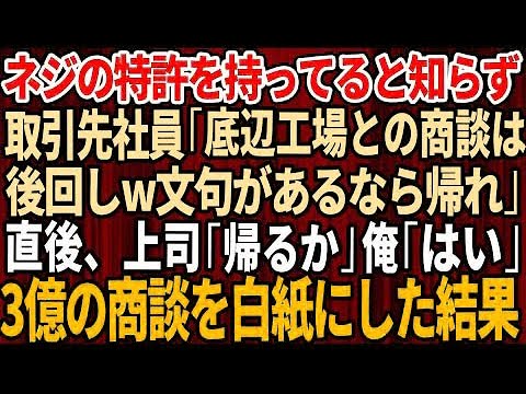 - タイトル: 【スカッとする話】俺の会社が特許権を持ってネジを作っていると知らず取引先のエリート社員「時代遅れの底辺工場との商談は後回し!文句あるなら帰れw」→言われた通り3億の発注を白紙にした結果
