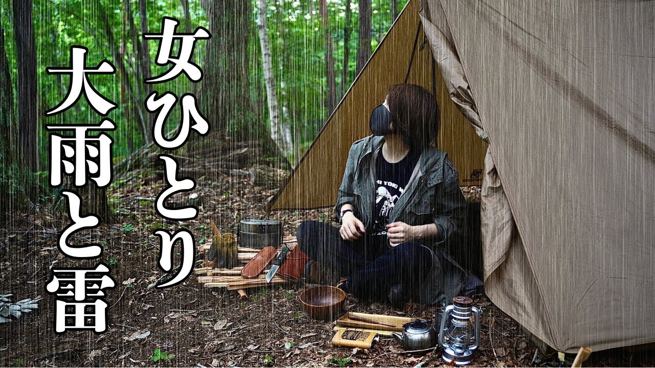 - タイトル: 【ソロキャンプ野営女子】大雨が降り雷が鳴り響く森にひとり野営