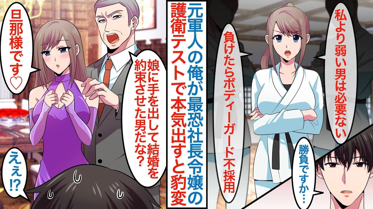 - タイトル: 【漫画】元軍人で今は無職の俺が柔道最強の社長令嬢のボディーガードになるが「私より弱いやつは必要ないから負けたら不採用で」俺は少しだけ本気を出したら父親に結婚相手として紹介されて【恋愛マンガ動画】