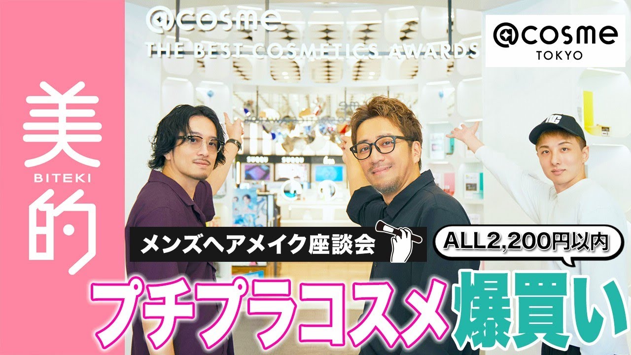- タイトル: 【予算は20,000円】アットコスメトーキョーでメンズヘアメイク3人がプチプラコスメを爆買い!プロが唸るオール2,200円以下のアイテムが勢ぞろい