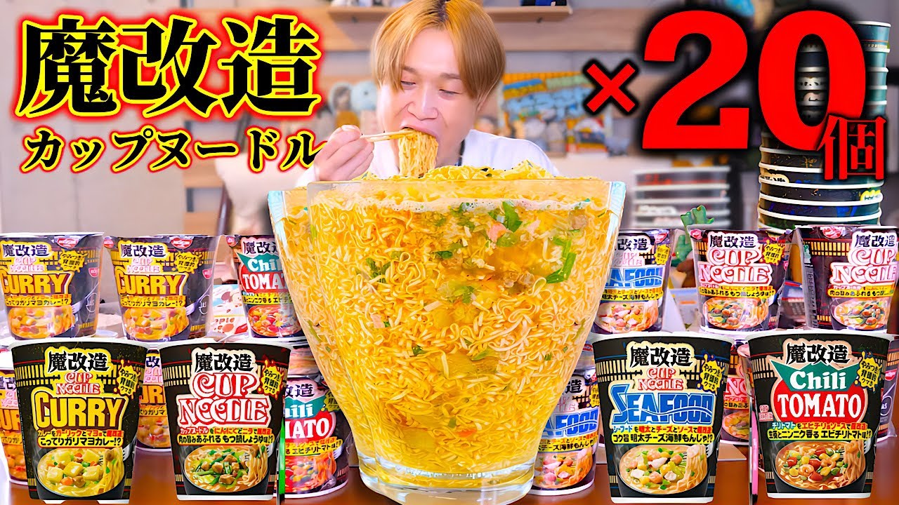 - タイトル: 【大食い】今話題の魔改造カップヌードル!!4種(20個)を全部混ぜて更に魔改造した結果…。【ぞうさんパクパク】【日清】