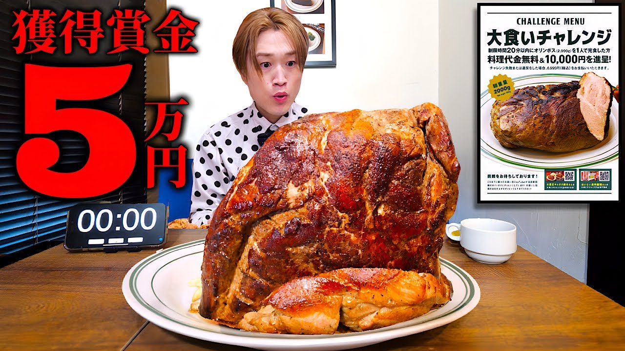 - タイトル: 【大食い】成功者0名…。巨大塊肉ステーキを制限時間30分で完食すれば賞金5万が貰える大食いチャレンジに挑む‼️【大胃王】【マロリーポークステーキ】