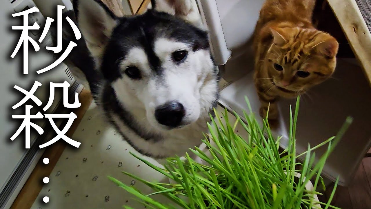 • タイトル: 初めて猫草を食べた子猫と犬達の反応がこちらです…