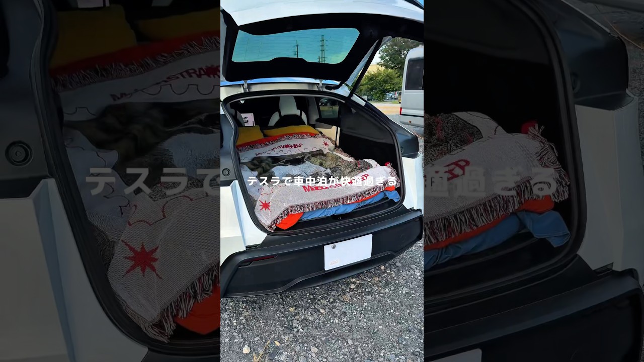 - タイトル: テスラで車中泊!夜も静かにエアコン使えるので快適に眠れました〜🥱EVの良いところまた見つけた! #tesla #テスラ #車中泊 #modely