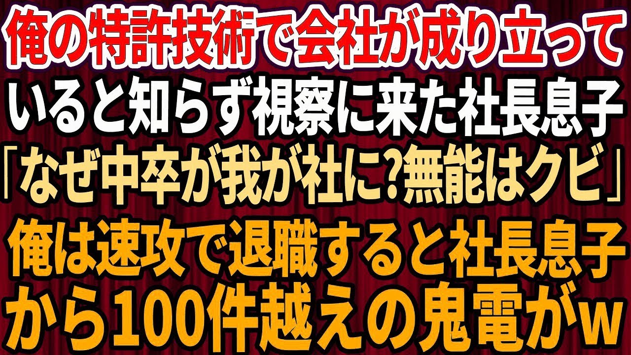 - タイトル: 【スカッと】俺の特許技術で会社が成り立っていると知らず、視察にきた社長息子「なぜ中卒が我が社にいる?無能はクビだ」俺「わかりました」→速攻で退職すると社長息子から100件越えの鬼電が