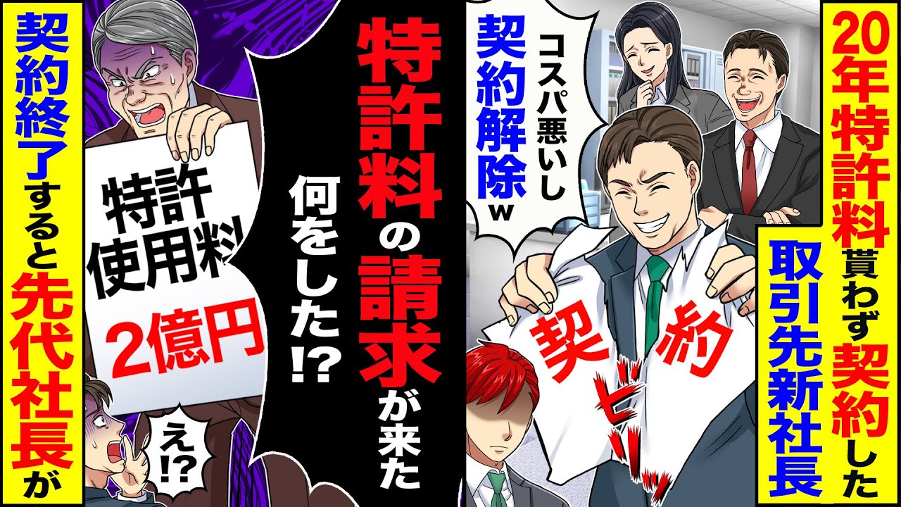 - タイトル: 【スカッと】20年特許料貰わず契約した取引先新社長「コスパ悪いし契約解除w2度と関わるなw」→「特許料の請求が来たぞ」契約終了すると先代社長が【漫画】【アニメ】【スカッとする話】【2ch】