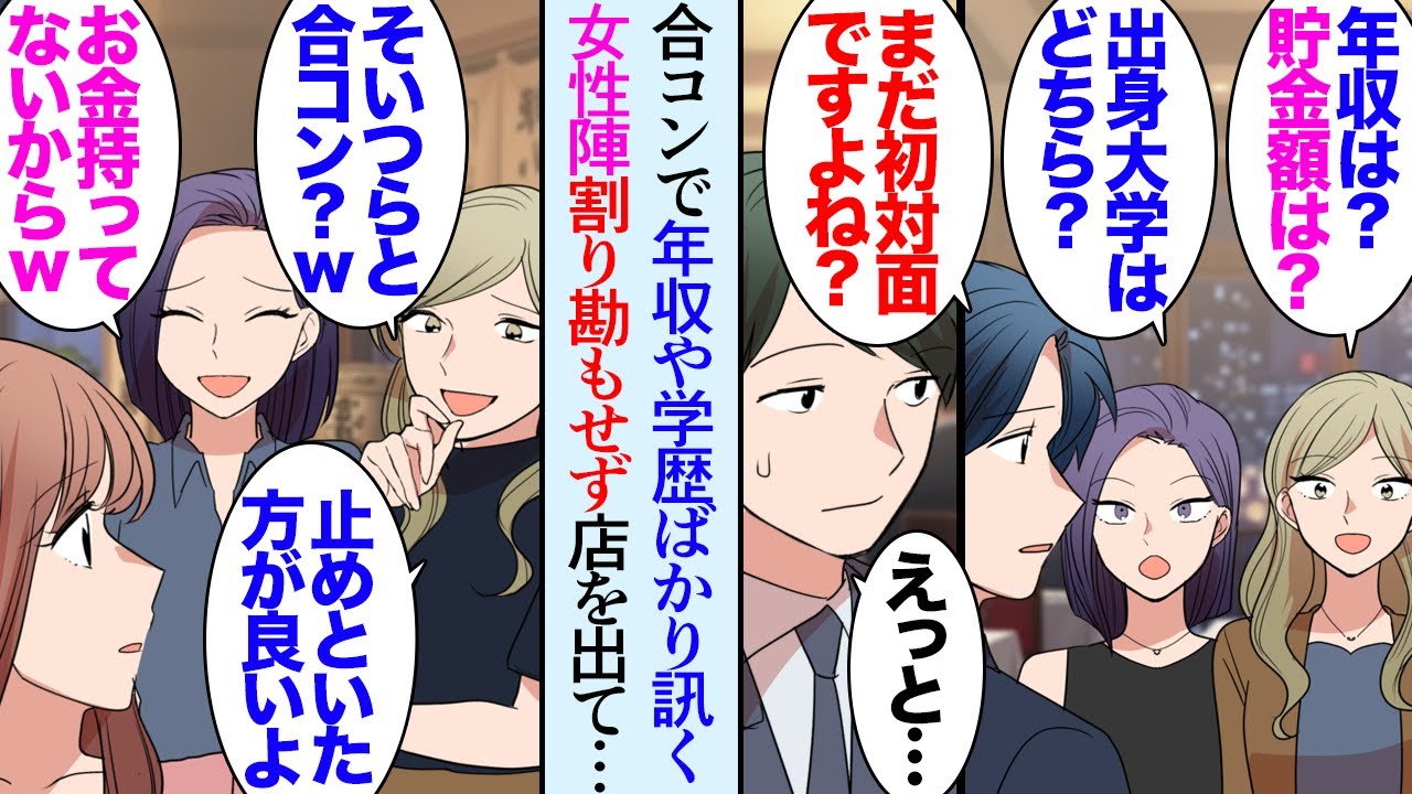 - タイトル: 【漫画】「年収はどのくらい?最終学歴は?」合コンで不躾な女性にウンザリ「ご馳走様でした〜」割り勘の提案もなく男性陣が全額支払い→連絡先交換しなかったことで「低学歴、低収入」と見下され…【マンガ動画】