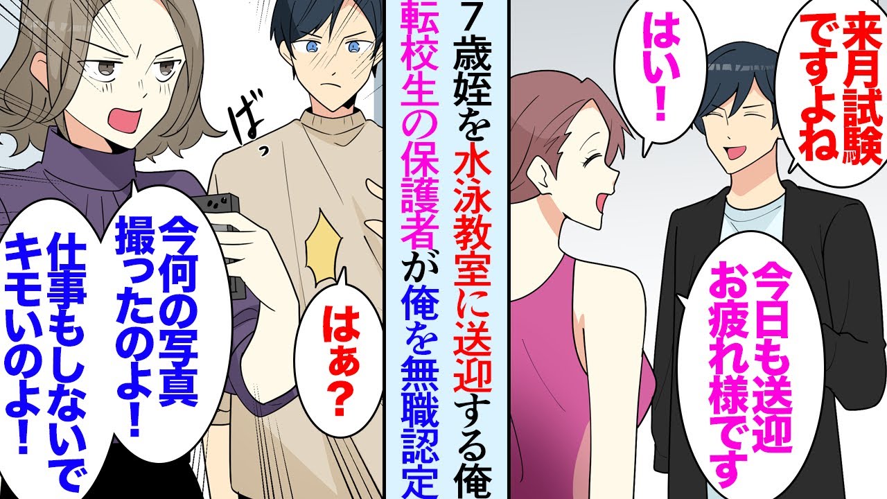 - タイトル: 【漫画】共働きの姉夫婦に代わり姪の習い事の送迎をする俺「平日に男が水泳教室の送迎なんて無職でしょ」転校してきた保護者に貶され→「変な写真撮ったんでしょ!」美人先生「何の騒ぎですか!」【マンガ動画】
