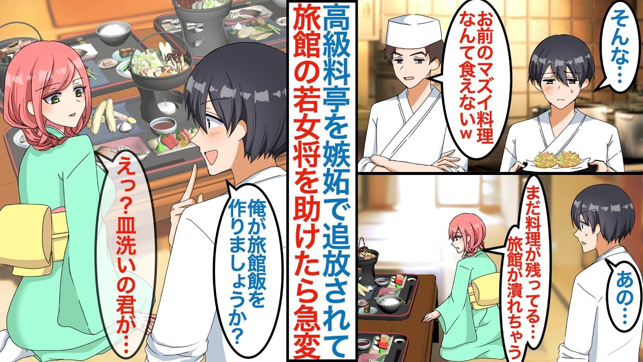 - タイトル: 【漫画】有名な高級料亭を追い出された俺が貧乏旅館を営む美人若女将のピンチに「料理作りましょうか?」皿洗いの俺が美女を本気をだして助けたら宿も繁盛するがライバル店も現れて【恋愛マンガ動画】