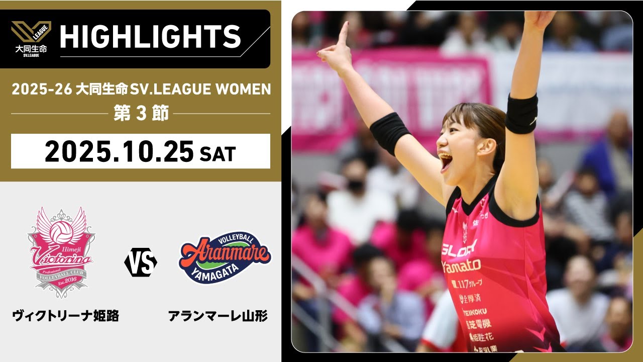 - タイトル: 【2025/10/25 ハイライト】2025-26 大同生命SV.LEAGUE WOMEN 第3節 GAME1 姫路 vs A山形