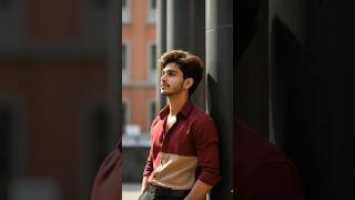 プロンプト例:「(あなたの顔写真を参照)若い男性のハイファッションなポートレート。暗い柱にもたれかかり、クールで物思いにふけるような雰囲気。赤とベージュのカラーブロックシャツを着て、現代的なエディトリアルルック。」