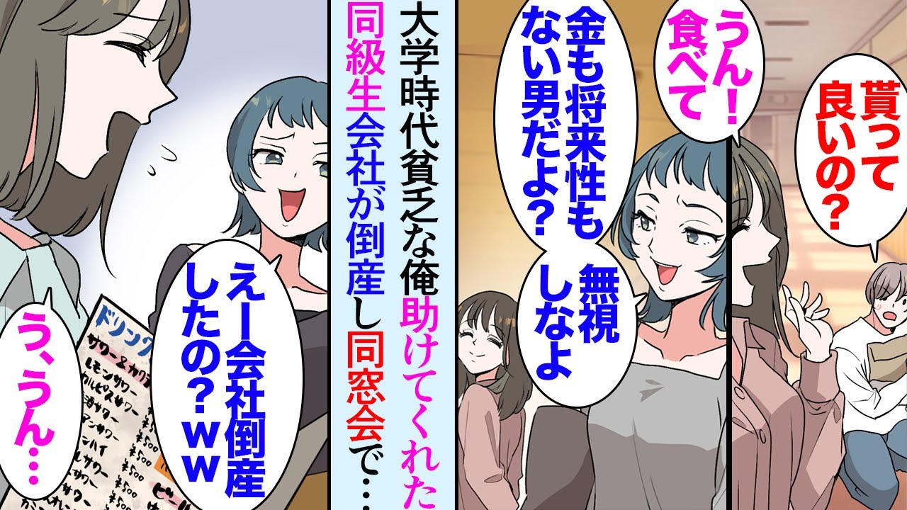 - タイトル: 【漫画】大学時代貧乏だった俺「そんな金も将来性もない男放っておきなよ」同級生に貶されてもいつも俺を助けてくれた同級生の女性が居た→「会社倒産したらしいぞ」恩返しのつもりで相談に乗った結果【マンガ動画】