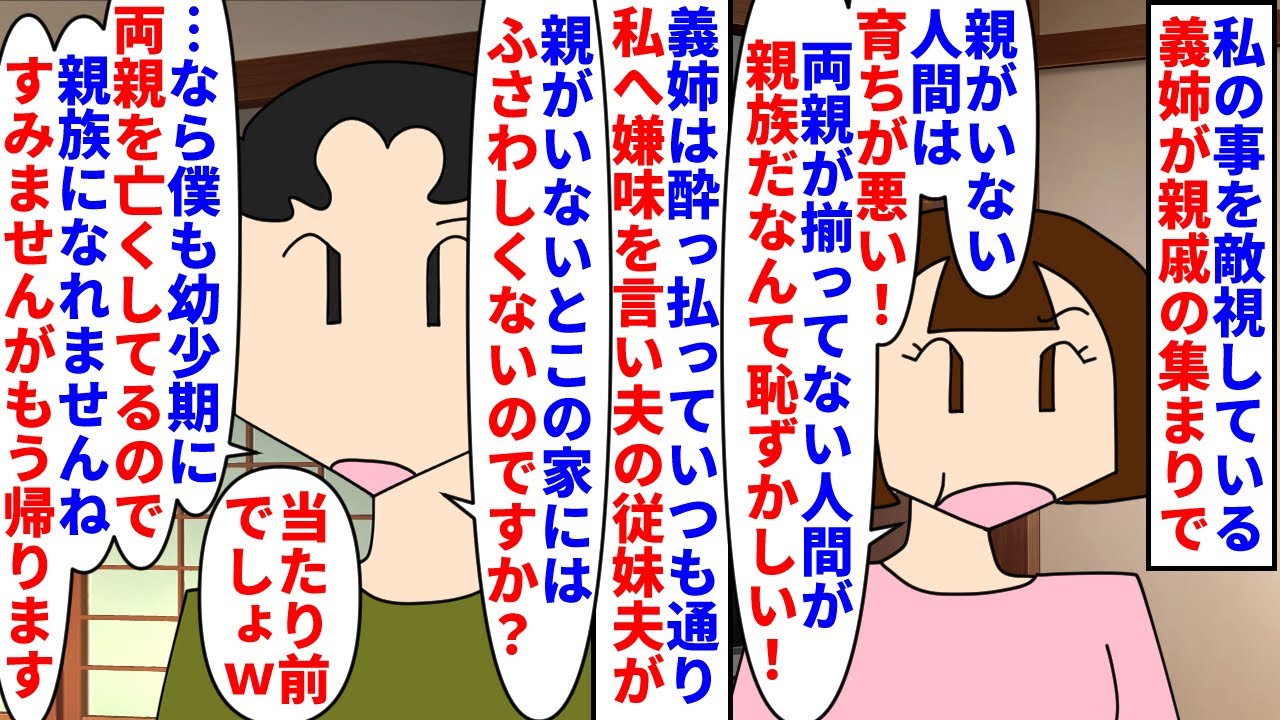 - タイトル: 【漫画】義姉「私は嫁に言っただけで…」従妹夫「失礼します」ひとり親の私の事を普段から敵視している義姉→親戚の集まりでもいつも通り親なしへの嫌味を言われ大袈裟にDQN返し(スカッと漫画)【マンガ動画】