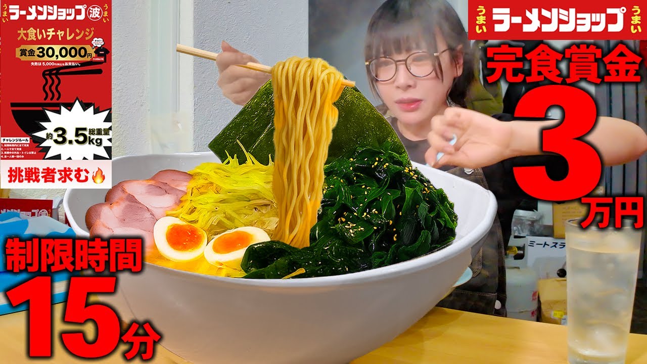 - タイトル: 【大食い】完食賞金3万円⁉️ラーメンショップで現代未聞のチャレンジメニューを見つけたので実際に挑戦してみた【海老原まよい】
