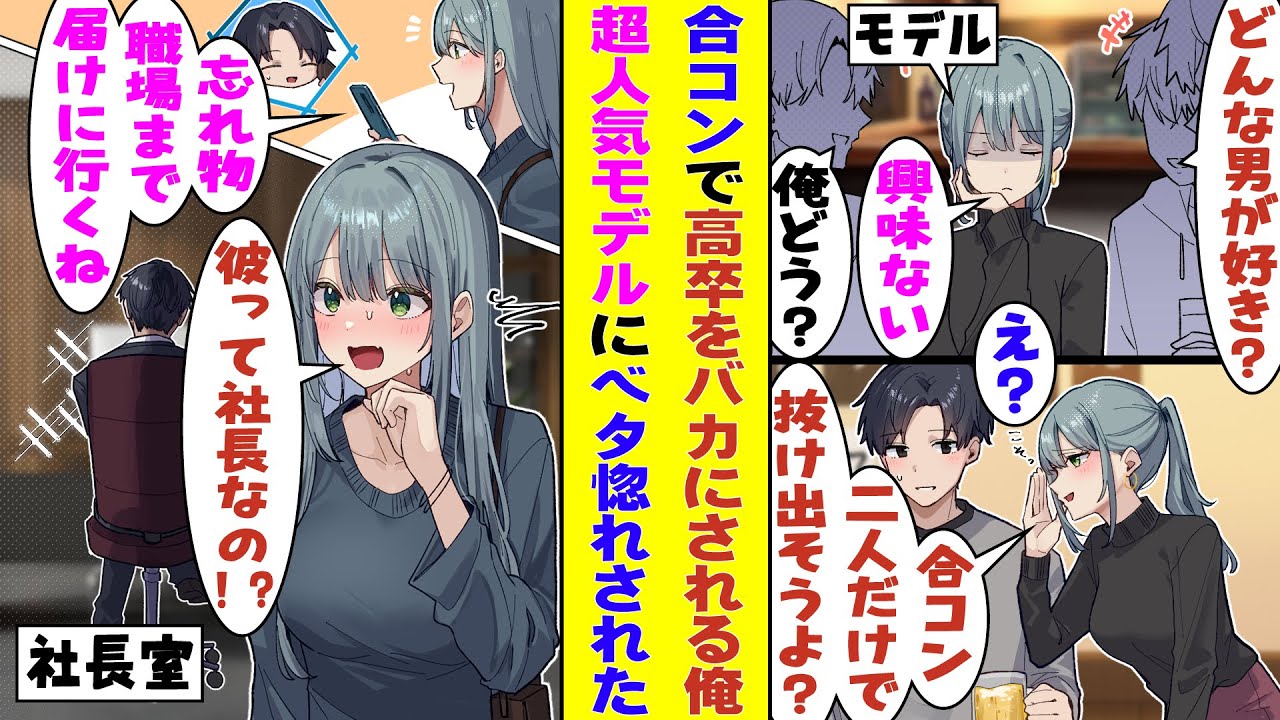 - タイトル: 【漫画】合コンにやってきたクールな人気モデルが、高卒でバカにされている非モテな俺に「二人だけで抜け出しちゃう?」と誘ってきた→その後、彼女は俺の隠された正体を知って、ベタ惚れしてしまう!?