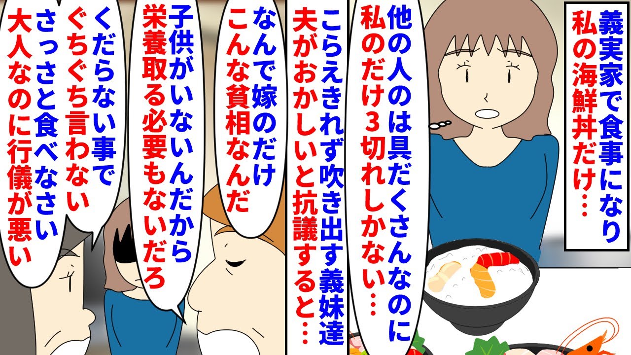 - タイトル: 【漫画】私「トロ…サーモン…ウニ…甘エビ…イクラ…カニ…」義実家で食事になり私の海鮮丼だけ刺し身が3切れだけ→他の人は具だくさんで豪華なので夫が抗議すると意地汚い嫁扱い(スカッと漫画)【マンガ動画】